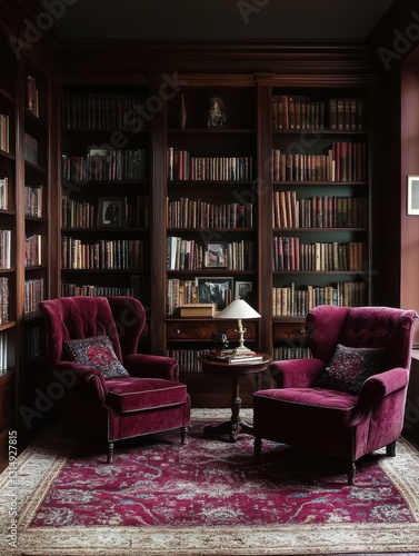 library, book, shelf, armchair, velvet, rug, dark, reading, interior, wooden, lamp, table, room, home, cosy, antique, classic, traditional, vintage, pattern, comfortable, arrangement, literature, furniture, lighting, decor, design, chair, space, old, corner, elegant, relaxing, study, quiet, detail, background, decoration, style, shade, fabric, soft, cushion, light, round, bookshelf, framed