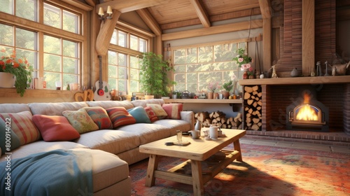 living room, cosy, fireplace, sofa, rug, coffee table, bookshelf, plant, flower, guitar, wood, brick, window, sunlight, interior design, home decor, cabin, filed, bungalow, retreat, get-away, relaxation, comfort, warmth, invitation, welcome, nest, haven, sanctuary, refuge, escape, hideaway, seclusion, privacy, calmness, serenity, peace, quiet, calm, stillness, solitude, contemplation, meditation