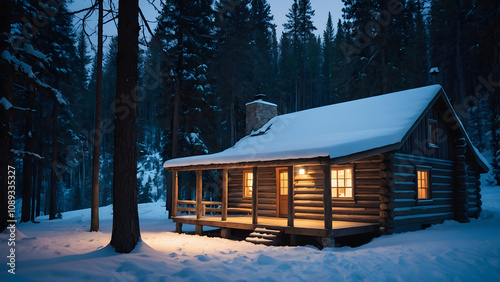 A cozy log cabin nestled in a snowy forest. The warm glow from the windows contrasts with the cold, wintery landscape. The cabin's rustic charm and snow-covered surroundings create a serene atmosphere