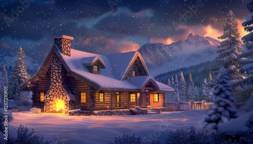A cozy log cabin with a warm fireplace glows in the snowy winter night with a mountain range in the background.