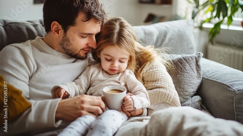 A cozy moment of a father and daughter sharing warm drinks while snuggling on a couch, surrounded by a peaceful home atmosphere.
