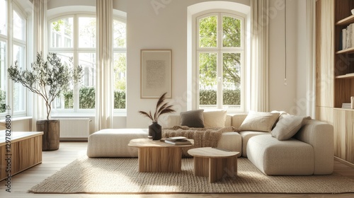 A cozy Nordic living room with a warm, neutral color palette, natural wood furniture, and a minimalist design, accented by a wool throw and large windows.