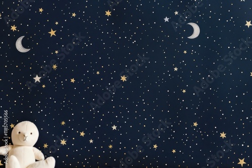 A cozy room with a starry night wall design and a plush toy, creating a soothing atmosphere for children.