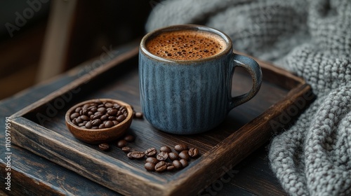 hot drink, mug, bean, wooden, tray, cosy, warm, drink, beverage, aroma, caffeine, morning, relaxation, comfort, texture, brown, ceramic, home, leisure, rustic, epicure, brewing, espresso, latte, cappuccino, sip, taste, culture, energy, lifestyle, still life, scene, warmth, enjoyment, coffee, rich, earthy, natural, inviting, handcraft, simplicity, ambience, ritual, favor, artisan, brew, soft, knitted, blanket