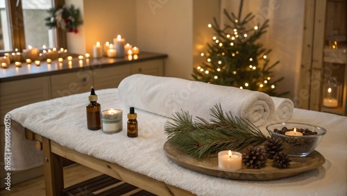 A cozy spa room with herbal compresses and oils for a relaxing winter massage
