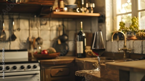 A cozy wine glass with bottle, set in a rustic kitchen with warm tones,