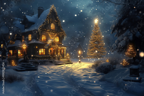A cozy winter evening in a snowy village with festive lights and a beautifully decorated Christmas tree