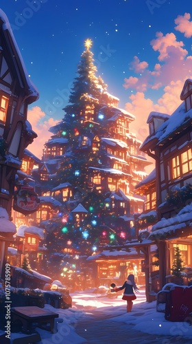 winter, christmas, village, tree, snow, girl, festive, holiday, lighting, celebration, magical, decoration, architecture, warmth, cosy, landscape, blue skies, gift, children, evening, shopping, traditional, people, joy, seasonal, family, community, cheerful, scenic, atmosphere, artistic, imagination, playful