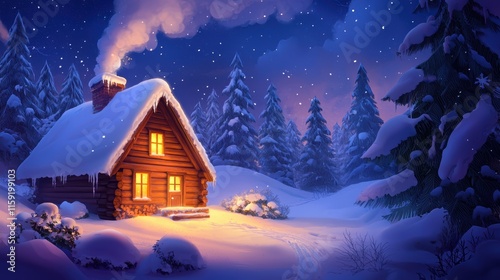 A cozy wooden cabin in a snowy landscape, illuminated warmly, surrounded by tall trees under a starry night sky.