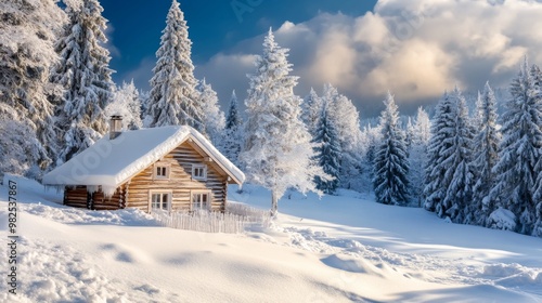 winter, snow, cabin, forest, tree, mountain, landscape, nature, cold, frost, ice, scenic, peaceful, tranquil, serene, beautiful, picturesque, idylli, cosy, rustic, wooden, bungalow, white, blue, sky, cloud, sun, sunlight, day, season, holiday, vacation, travel, adventure, environment, weather, climate, glacé, snowy, wilderness, solitude, remote, secluded, quiet, serenity