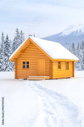 A cozy wooden cabin sits on a snowy field, nestled amongst snow-covered evergreens and a mountain backdrop