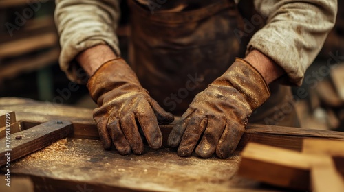 A craftsman wearing worn-out leather gloves while working with wood, emphasizing durability and ruggedness.