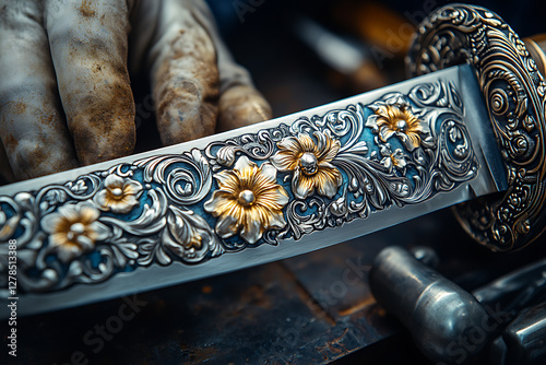 A craftsman works on a piece of jewelry or a dagger, engraving a complex ornament by hand. The focus is on microscopic details, the shine of metal and the precision of work.