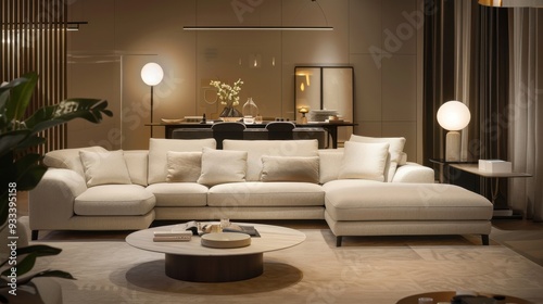 A cream-colored sectional sofa in a modern living room, complemented by soft lighting