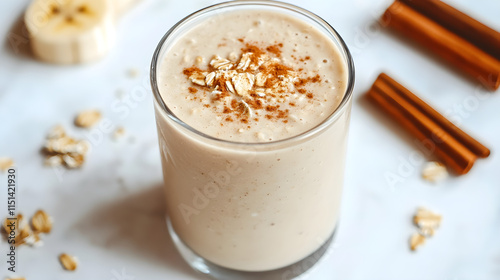 A creamy beige smoothie with oatmeal, banana, and a sprinkle of cinnamon, served in a glass cup