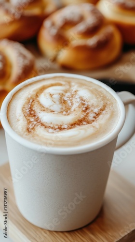 A creamy cup of coffee with beautiful latte art sits on a wooden table alongside freshly baked pastries, creating an inviting atmosphere for relaxation and enjoyment
