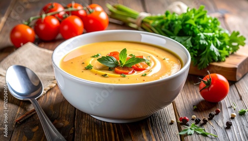 A creamy yellow soup in a white bowl, garnished with tomatoes and basil, on a wooden table