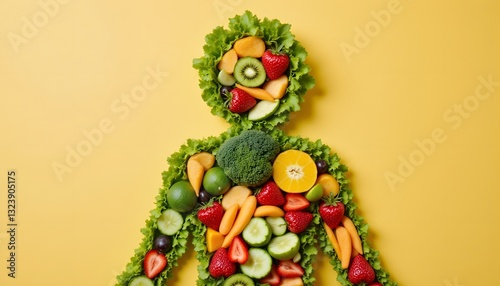 A creative and visually striking composition featuring a human shape made entirely of various fresh fruits and vegetables, with lettuce forming the body and head