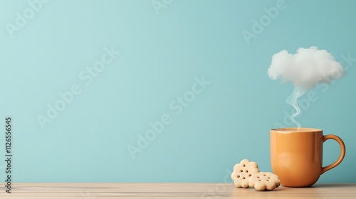 A Creative Concept of a Warm Beverage with Cookie Accompaniment and a Whimsical Cloud on a Calm Aqua Background