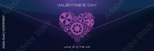 A creative minimalist Valentines Day poster design with a futuristic theme. There's a heart made of gears. The background is a dark blue gradient. The text "Valentine's Day" is in white, modern fon