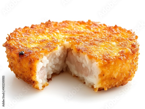 A crispy golden-brown rice cake with a savory filling is partially sliced showcasing its delicious texture and appetizing interior.