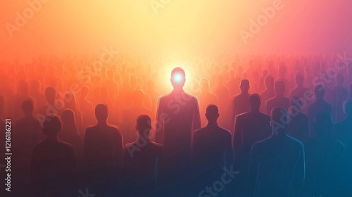 A crowd of silhouettes, with one figure glowing brightly in the center to symbolize the ideal candidate, set against a minimalist and futuristic gradient background, 16:9