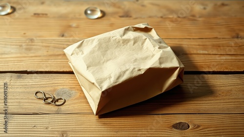 A crumpled brown paper bag sits on a rustic wooden surface, accompanied by small decorative elements.