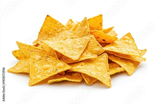 A crunchy pile of golden tortilla chips perfect for snacking or parties photographed against a bright white background with sharp focus
