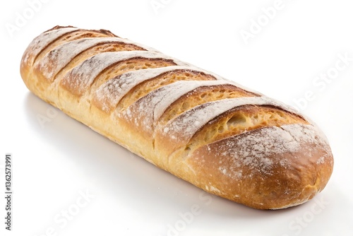 bread, loaf, long, crust, gold, brown, flour, dusting, baked, fresh, artisan, bakery, delicious, food, cookery, pastry, wheat, receipe, cooking, baking, carb, staple, meal, snack, breakfast, lunch, dinner, tasty, deliciously, appetising, white, background, isolated