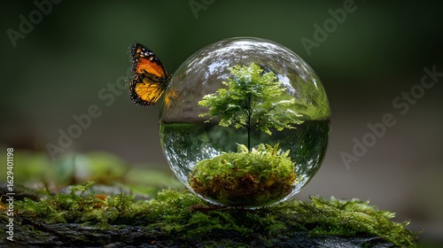A crystal ball on mossy ground, a little tree inside, with a butterfly admiring it, representing preservation