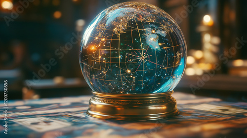 A crystal ball with glowing star charts, planetary diagrams, and astrology symbols swirling inside, offering glimpses of destiny