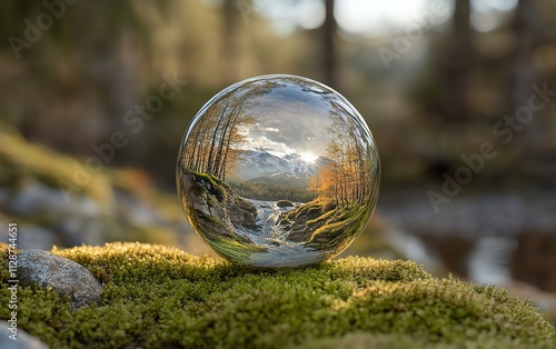 A crystalclear globe in a mosscovered forest, representing Earth Day, carbonneutral energy, and sustainable environmental care for saving the Earth
