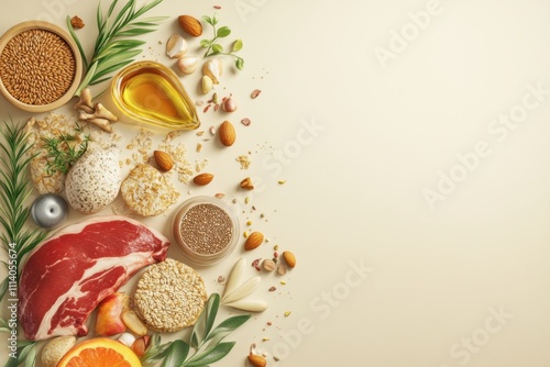 food, healthy, ingredient, nourishment, diet, meat, beef, steak, nut, almond, seed, flax, herb, rosemary, garlic, oil, olive, grain, cereal, cracker, sesame, citrous, orange, composition, epicure, delicious, tasty, fresh, natural, organic, cookery, culinary, receipe, eat, meal, dinner, breakfast, lunch, plant, vegetable