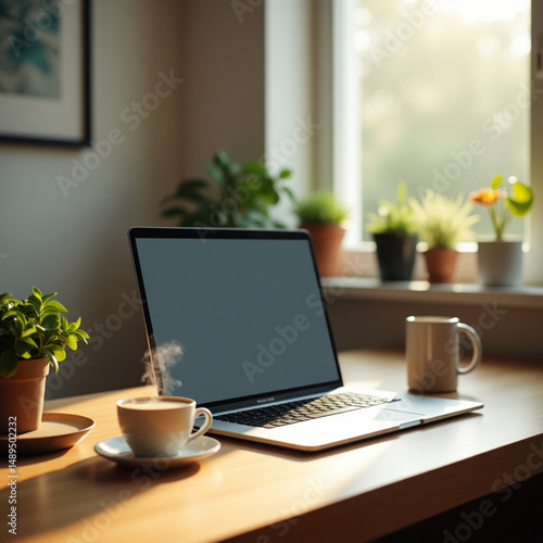 hot drink, laptop, desk, office, business, cup, bright, room, work, technology, computer, workspace, table, interior, modern, workplace, drink, hot, beverage, portable, electronic, indoor, empty, nobody, corporate, professional, design, contemporary, simple, clean, white, wooden, surface, object, equipment, communication, cyberspace, online, digital, screen, keyboard, mouse, stationery, mug, caffeine, break, job, occupation, studying