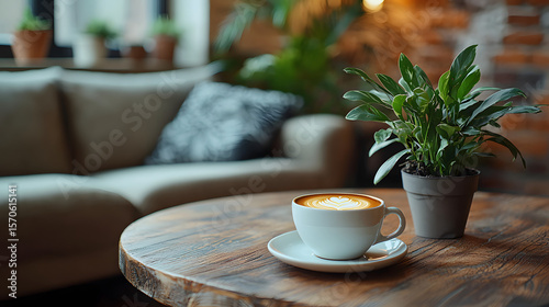 a cup of coffee sitting on top of a wooden table next to a couch and a potted plant on top of a wooden table