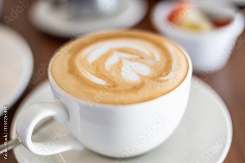 A cup of fresh hot cappuccino with beautiful latte art in a white ceramic cup on a wooden table. A perfect morning coffee break at a cozy cafe, beverage background.