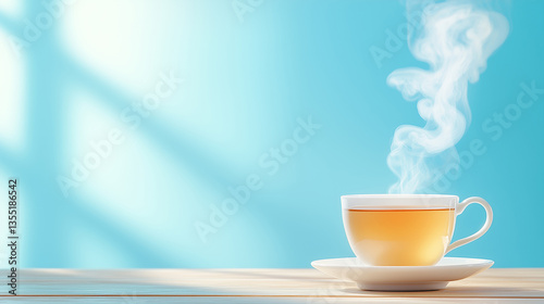 A cup of hot tea sits on a saucer atop a wooden table. Steam rises from the aromatic beverage, contrasting against a soft blue backdrop, creating a tranquil atmosphere perfect for relaxation