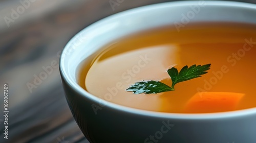 cup, light, colours, view, white, ceramic, soup, broth, single, green, leaf, pop, freshness, scene, wooden, surface, warm, rustic, liquid, orange, yellow, green leaf