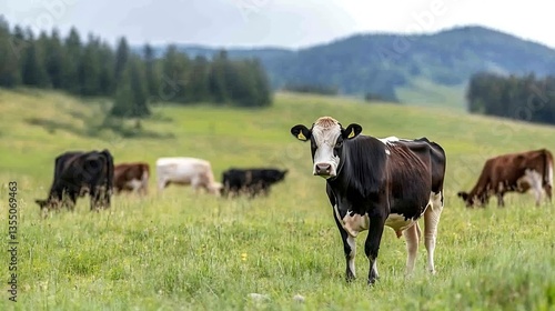 A curious cow standing confidently in a lush green pasture surrounded by a herd in a picturesque rural setting : Generative AI