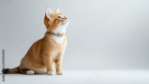 A curious orange cat gazes upward, showcasing its playful and charming personality against a minimalist background.