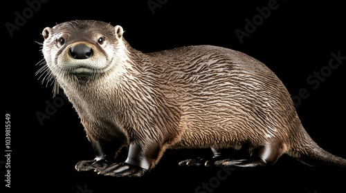 A curious river otter with wet fur, looking directly at the camera, isolated on a black background.