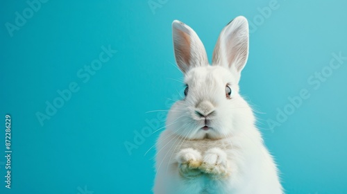 A Curious White Rabbit with Paws Up, Looking Slightly to the Side Against a Soft Blue Background, Captivating and Sweet