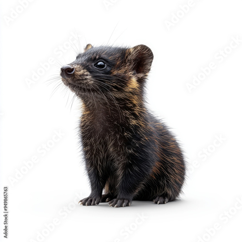 A cute baby mongoose with a fluffy fur coat sits attentively on a white background, capturing its curious and innocent expression.
