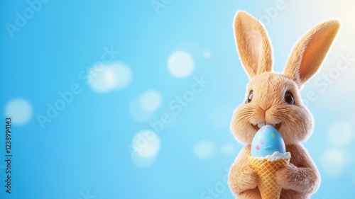 A cute bunny holding an Easter egg-shaped ice cream cone against a soft blue background on Easter Day.