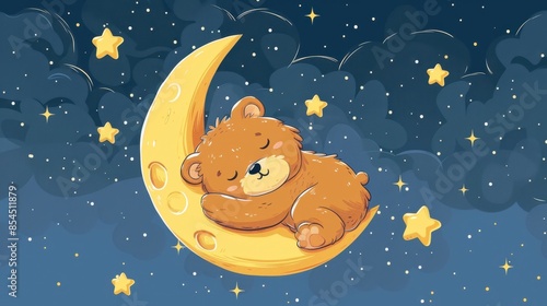 A cute cartoon bear sleeps peacefully on a crescent moon, surrounded by twinkling stars.