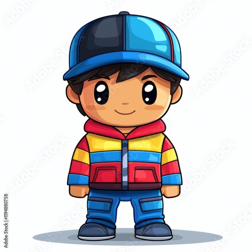 boy, cartoon, cute, children, children, jacket, colourful, clothes, apparel, attire, fashion, style, happy, smiling, cheerful, friendly, playful, adorable, charming, sweet, innocent, young, small, little, tiny, miniature, big, eye, large, head, cap, hat, blue, red, yellow, pant, trousers, shoe, footwear, standing, pose, illustration, graphic, design, artwork, digital, art, image