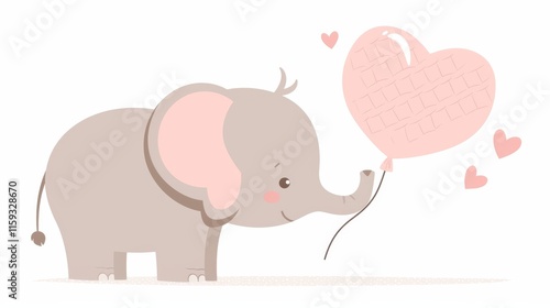A cute cartoon elephant holding a pink heart-shaped balloon, surrounded by small hearts, symbolizing love and joy.