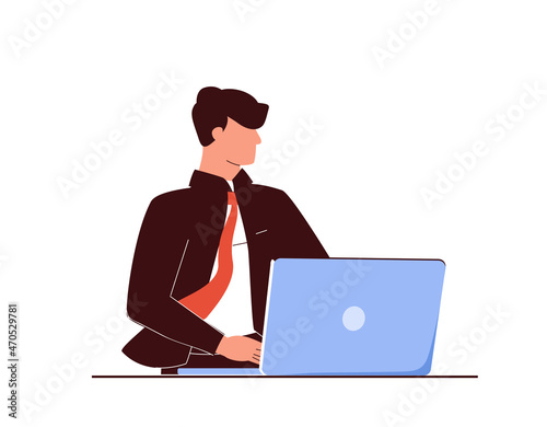 A cute cartoon man is working with a laptop in his workplace. He is working, smiling and looking at the display.