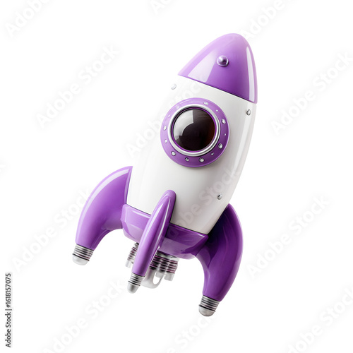 A cute cartoon purple and white toy rocket ship with a round window isolated on transparent background