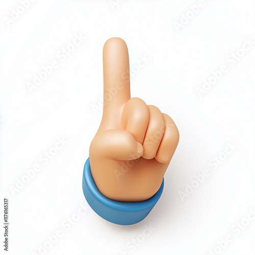 A cute cartoon-style icon with a 3D rendering of a hand making a gesture of extending the index finger to point upwards. Isolated on white background.